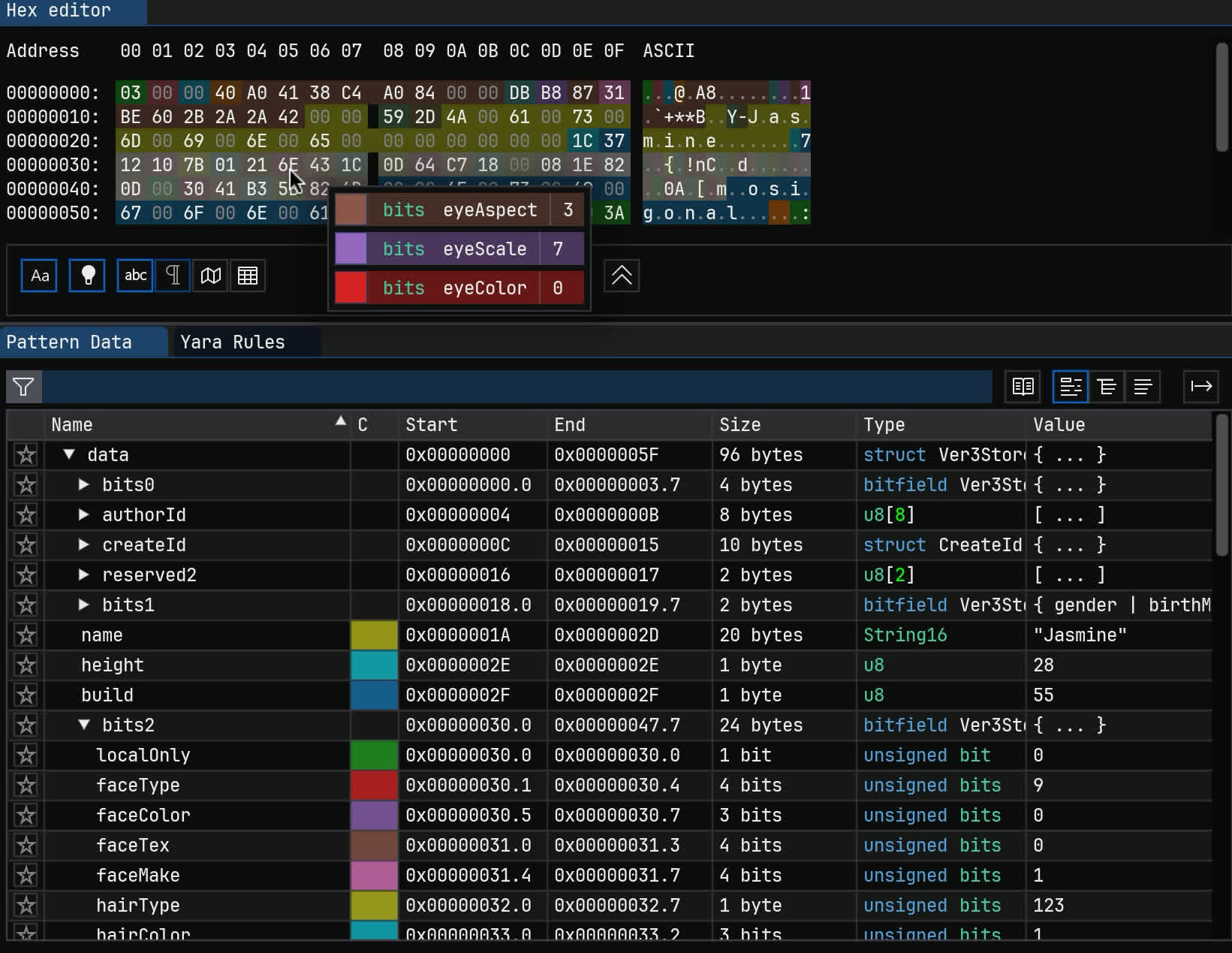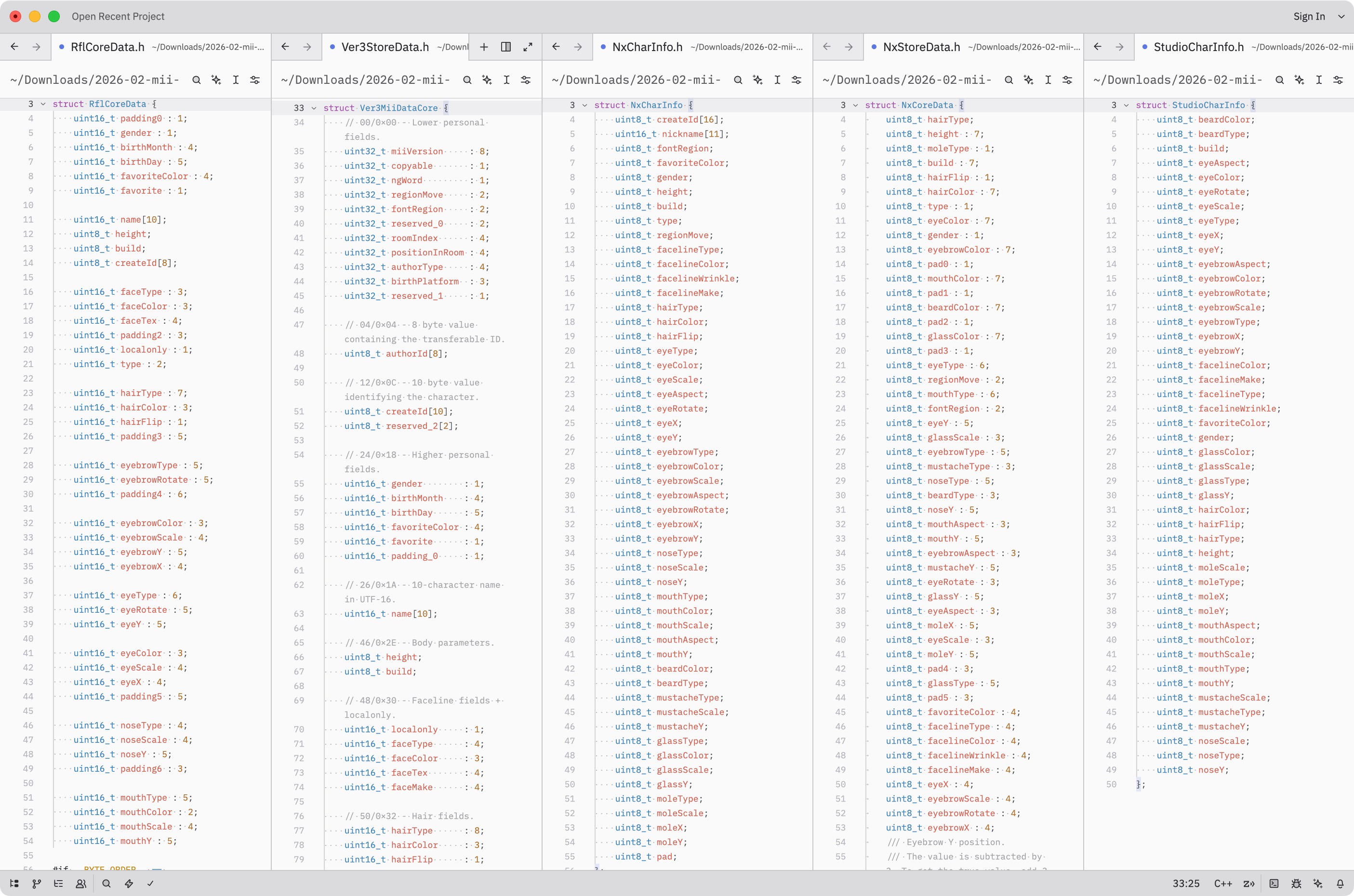 There are dozens of fields, spread out across a 96-byte structure that’s been more or less the same since Miis debuted in 2006.