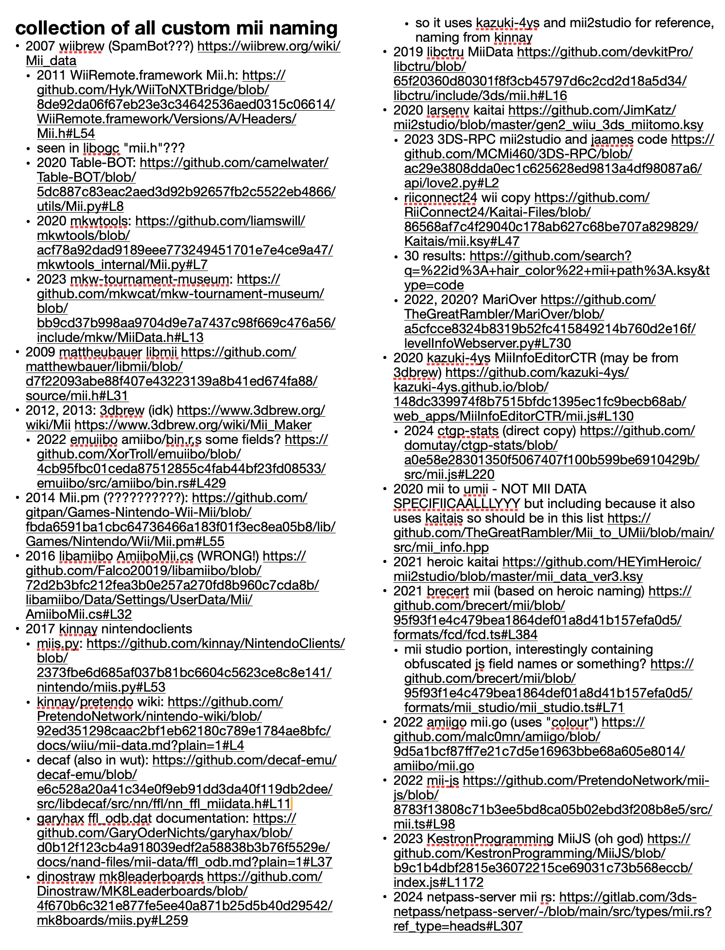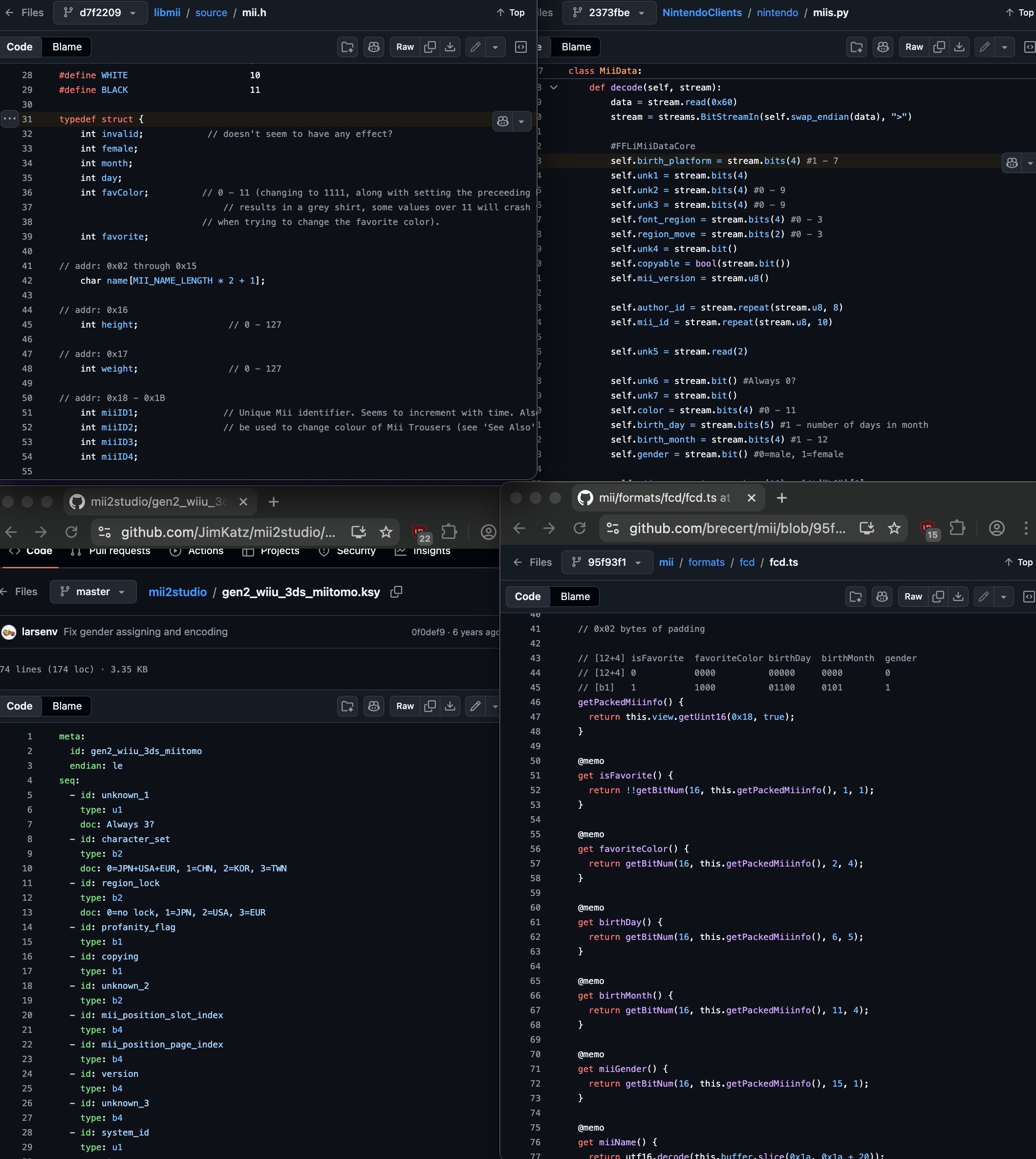 I spent some time cataloging every Mii implementation I could find on the internet. There are implementations in most major languages: JavaScript, Python, C#, Rust, Go… and they all have their own problems. Some are incomplete. Some have fields guessed at (or just wrong).