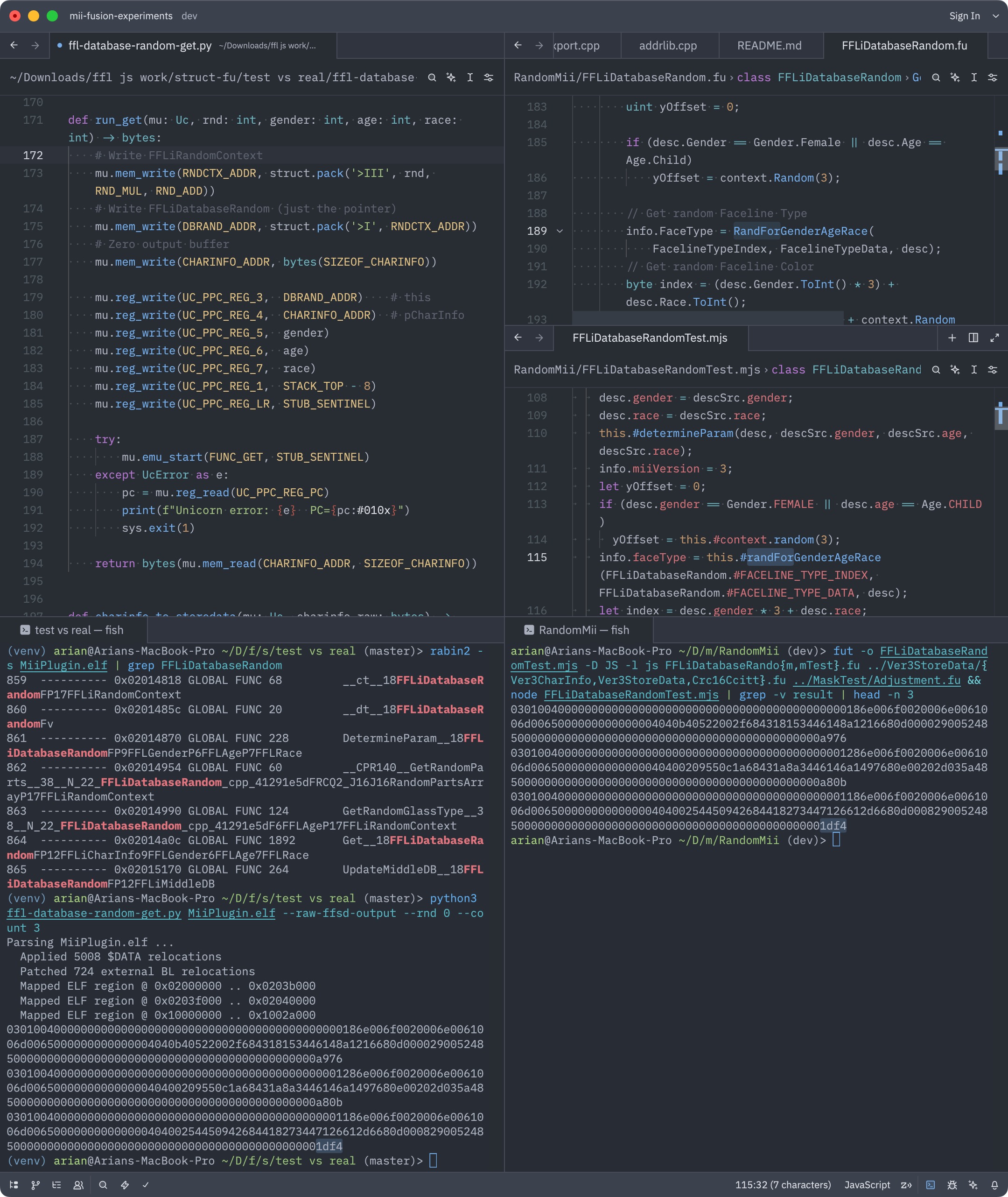 - I validated my random Mii implementation by running the same seed through my Fusion code versus an emulator that executed the function in FFL directly.