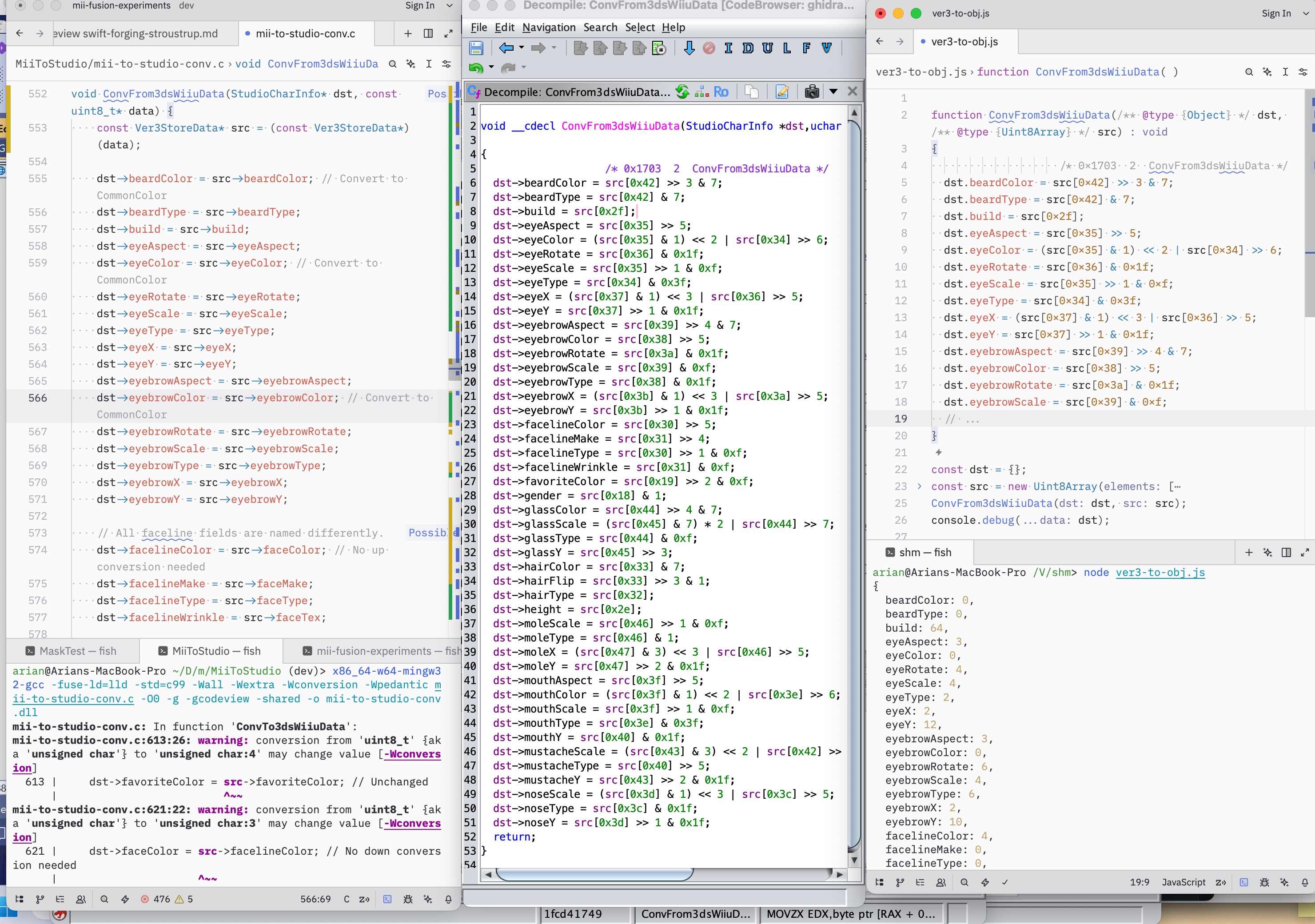 That is until I realized something. If I simply wrote the Mii conversion functions in C first, then I decompile it with Ghidra and get this. It’s the same logic, but auto-generated and will work when pasted in any language!