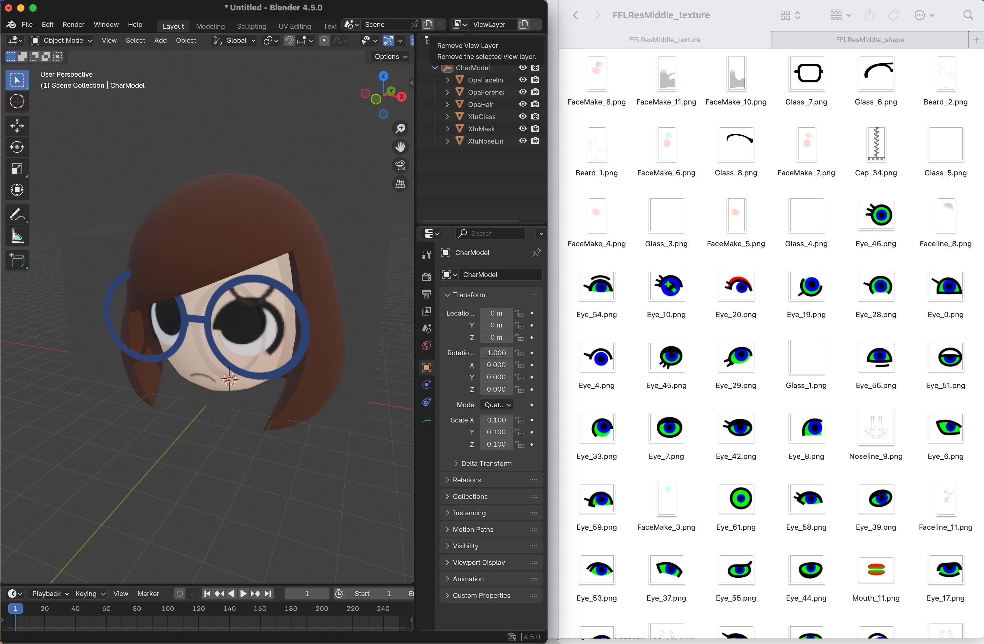 A Mii head model imported into Blender. It was created by FFL using the textures (shown on the right) and shapes in the resource file.