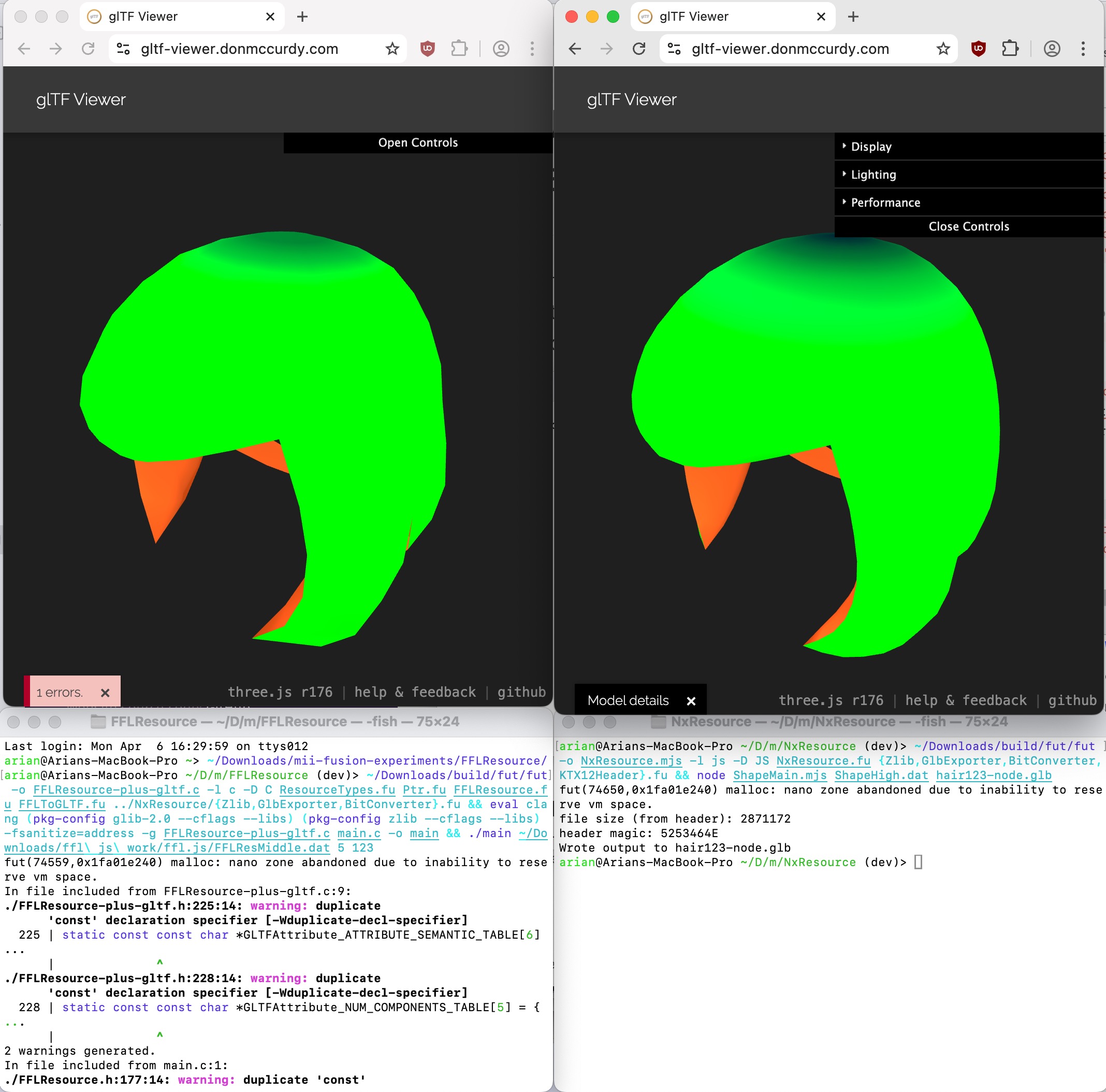 Pure Fusion code exporting a glTF model of the hair mesh. Left = From FFLResMiddle.dat in C, Right = from Switch ShapeHigh.dat in JS. Two languages, same code.