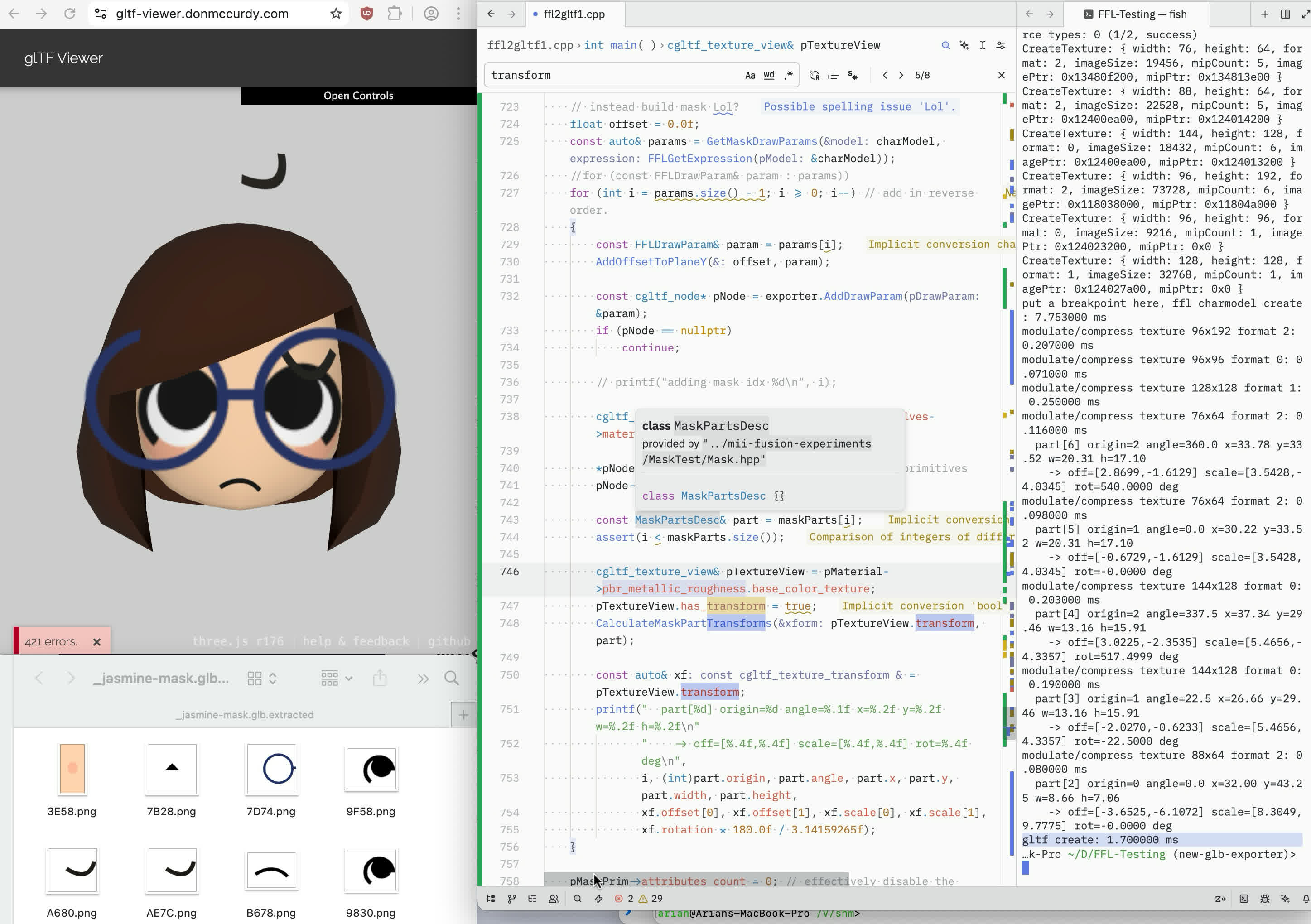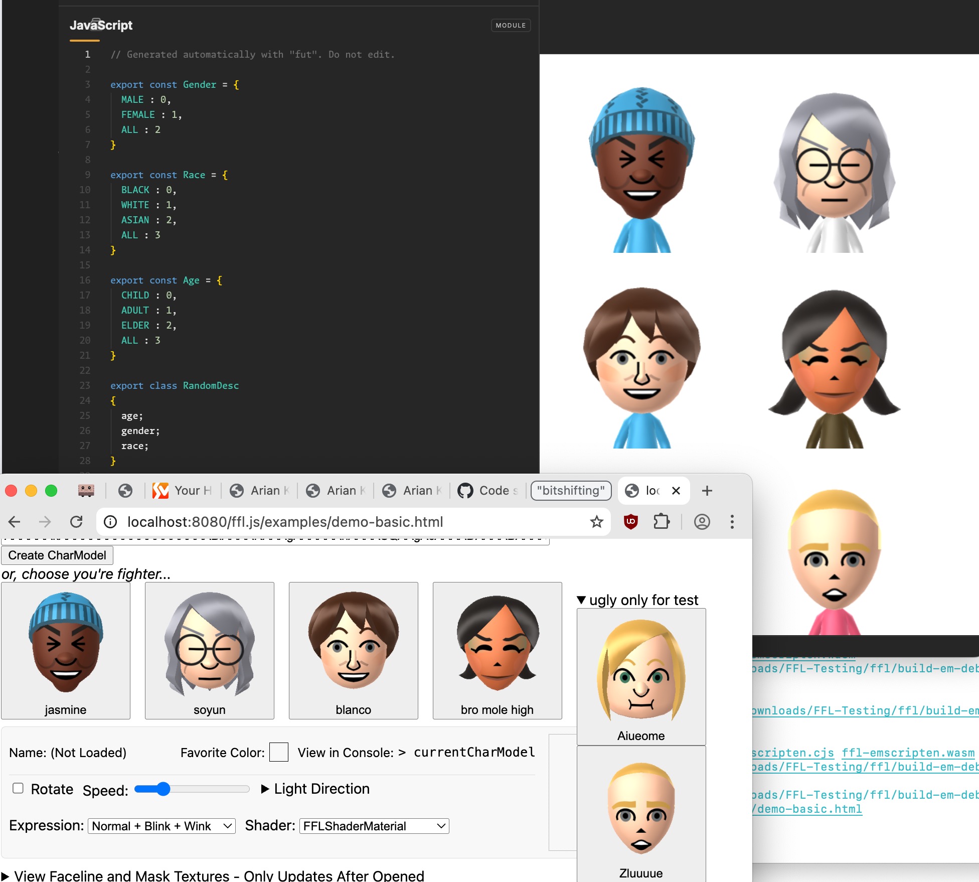 - End-to-end rendering: CharModelHelper.fu and Mask.fu work standalone for shapes and textures respectively, but need to be connected in some way for a full Mii head model.