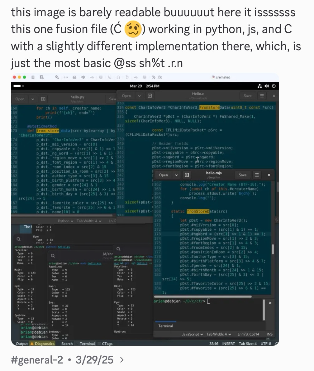 I did play with some things to make this happen in JS (my struct-fu port that lead to FFL.js, hence “distractions”), but, I was never very fond of being tied to one language. I remember writing snippets of Mii conversion code in C++ for the renderer, JS for the website, Go for the web server, then others used Python, C#, Rust… would I have to rewrite this thing 6 times?