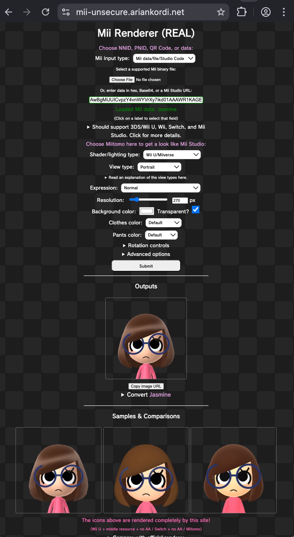The website, hosted at… mii-unsecure.ariankordi.net.