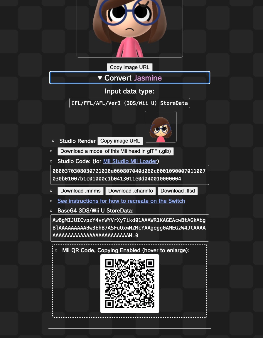 By September 2024 (5 months in), I had some code for converting Mii data formats ready and wanted to add it to the site in some way. I ended up doing this, and you can see how versatile this became.